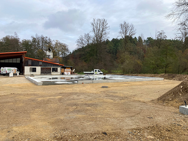 Der bisherige Baufortschritt läßt die Halle bereits gut erkennen. Noch im Dezember 2021 wurde die Bodenplatte betoniert und die Erschließung fertiggestellt.